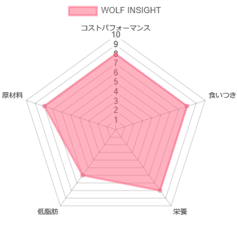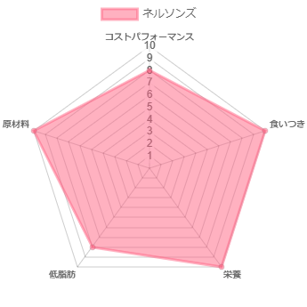 *ヒューマングレードの食品工場から仕入れた肉・魚を使用。*乾燥原材料等はペットフード用に生産されたものを使用。 評価グラフ