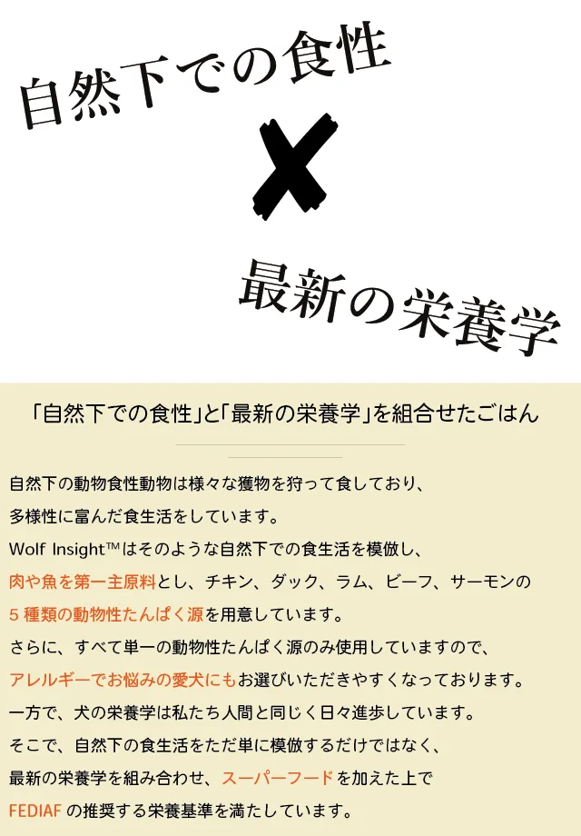 ラム*(正肉35%、乾燥22%)、乾燥サツマイモ、乾燥豆**、ラムファット(5%)、ビートファイバー、ラムストック(3%)、乾燥ミント、オメガ3サプリメント、乾燥ザクロ、ミネラル(亜鉛、鉄、マンガン、銅、ヨウ素、セレン)、ビタミン(A、D3、E)、乾燥マルベリー、乾燥ブロッコリー、乾燥フェンネル、フラクトオリゴ糖、マンナンオリゴ糖、オリーブエキス *グラスフェッド **基本的にはそら豆となります。ただし、シーズンや原材料の調達具合によってかわる可能性もありますので、乾燥豆としております。 ***正肉と乾燥肉はミックストコフェロール、ローズマリーエキスにて酸化防止しております。フード製造時の原材料としては使用しておりませんので、原材料への記載はありません。 【タンパク質:24.5%以上】【脂質:13.5%以上】【粗繊維:5.3%以下】【灰分:13.5%以下】【水分:9%以下】【エネルギー:361kcal/100g】 『WOLF INSIGHT』のココがポイント!