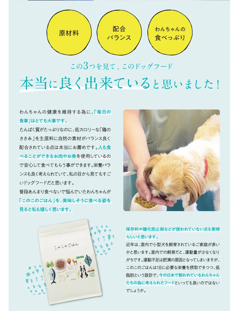 かわいい子供(愛犬)なのにいままで食べ物に対して無頓着でした。ネットで「このこのごはん」を知りました。食が細く、時にはまったく食べなかったり、手を焼いてましたが、食いつき良い!今じゃごはんを待ち遠しく感じてます。