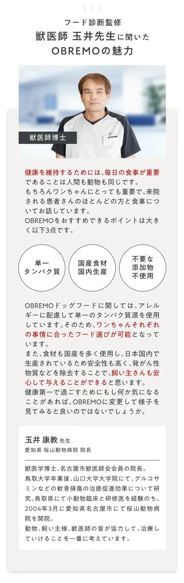 「目元が気になる」「便が安定しない」「食いつきにムラがある」そんな小型犬オーナーの“あるある”な悩みに徹底的に向き合って開発。なんといってもOBREMOの特徴は、『小型犬専用に作られた“完全無添加の国産ドッグフード』だということ。