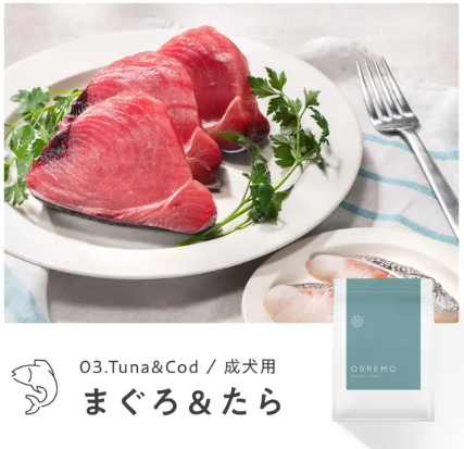OBREMO「まぐろ&たら」:特徴OBREMOでは国産のまぐろ&たらをバランスよく配合。魚由来のフードは高タンパク・低カロリーでありながら脂肪酸やミネラルも豊富で、健康的な体づくりをサポート。さらに2種類の魚を組み合わせることで酸化リスクを抑え、品質の安定性も向上しています。「お魚のドッグフードは初めて」という飼い主さんにも選ばれている、やさしい味わいの人気メニューです。