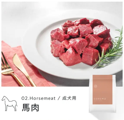 OBREMO「馬肉」:特徴近年注目を集めている馬肉は他の肉類と比べてアレルゲンになりにくく、アレルギーに配慮したい愛犬にも選ばれています。さらに、体内で合成できない「必須脂肪酸」を豊富に含み、皮膚や毛並みの健康維持をサポートします。低脂肪・高タンパクでヘルシーな点も人気の理由です。