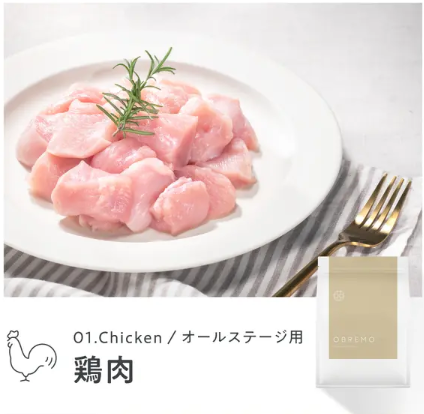 OBREMO「鶏肉」:特徴九州産の地鶏を使用。鶏肉は高タンパク・低脂質で消化吸収にも優れた、愛犬の健康をサポートする理想的なお肉。たんぱく質の質を示す「アミノ酸スコア」も、全食材の中で最高水準を誇ります。スタンダードかつクセが少ないため、初めてOBREMOを試す方にもおすすめの人気フードです。
