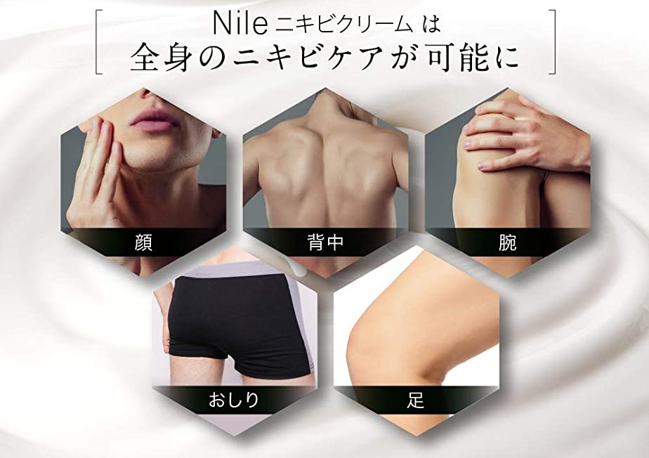 Nileアクネケアクリームは非常に肌への馴染みがよく、ベタつきにくい使用感となっているため顔以外にも不快感なく塗布することができます。