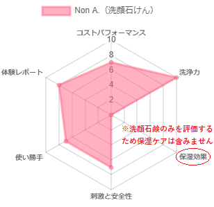 上記はNon A.洗顔石鹸のみの評価データです。洗顔のみですので洗顔後の保湿ケアは含みません。