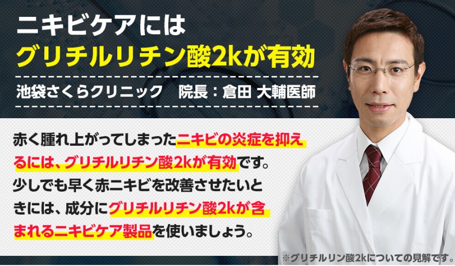 赤く腫れあがったニキビの炎症を抑えたりニキビの発生を防ぐのに有効な成分が『グリチルリチン酸2K』