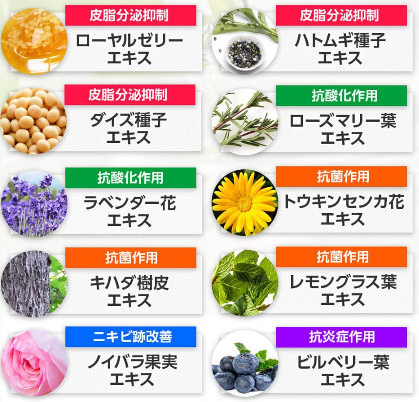 植物エキス10種類により皮脂の分泌を抑制する効果と抗菌・抗炎症作用により肌を更に鎮静化させます。