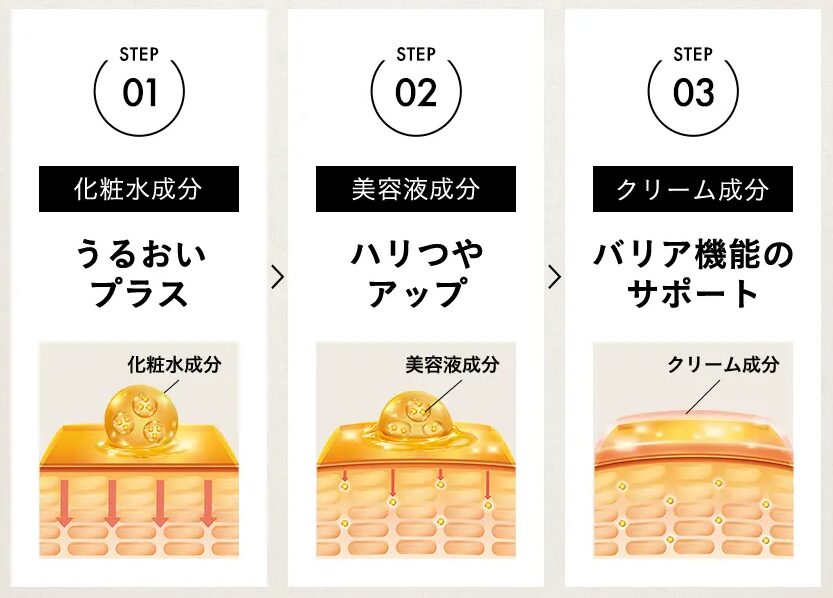 サントリーが開発した3層時間差浸透*3テクノロジー*4で化粧水、美容液、クリームの役割順にお肌に馴染む。
