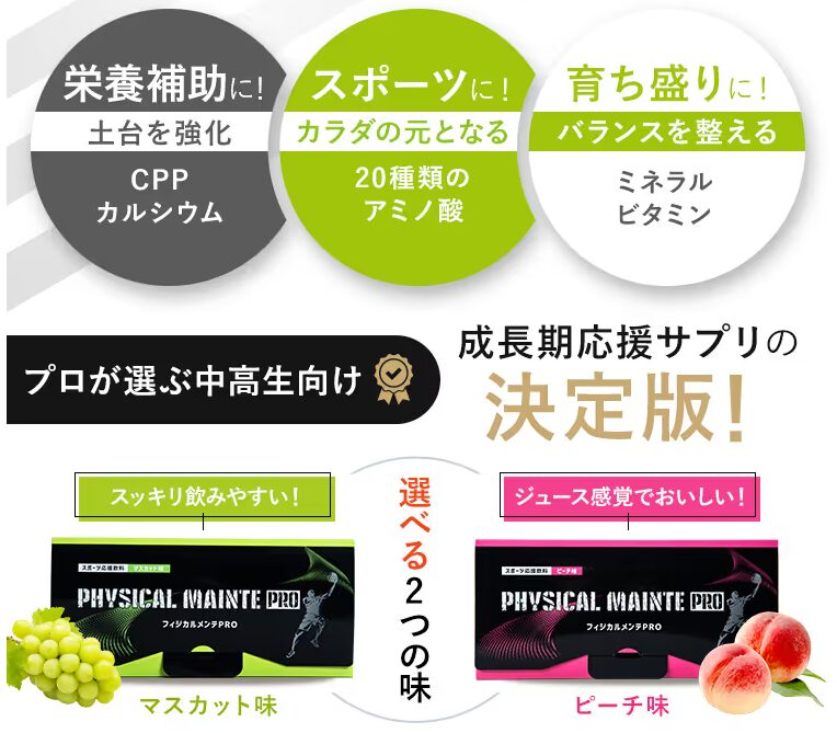 「成長期を逃したくない」「部活のパフォーマンスを最後まで高めたい」そんな成長期の中高生アスリート”の身体づくりをサポートする成長サプリがフィジカルメンテPRO。